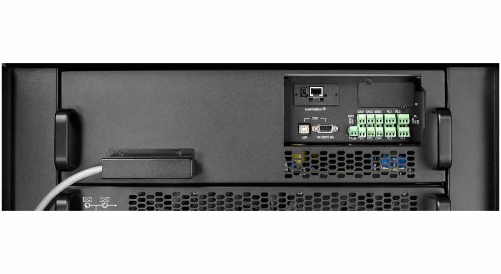A rendelkezésre álló kommunikációs interfészeken keresztül – RS-232, RS-485, USB (1) vagy relés interfészek – a rendszer könnyen integrálható SNMP platformokba és virtualizált környezetekbe is.