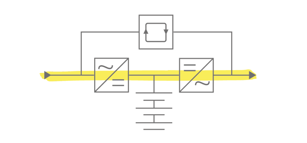 Ezek a rendszerek folyamatosan átalakítják a váltakozó áramot egyenárammá, majd újra vissza váltakozó árammá, így tökéletes szinuszhullámot állítanak elő PF=1 teljesítménytényezővel.