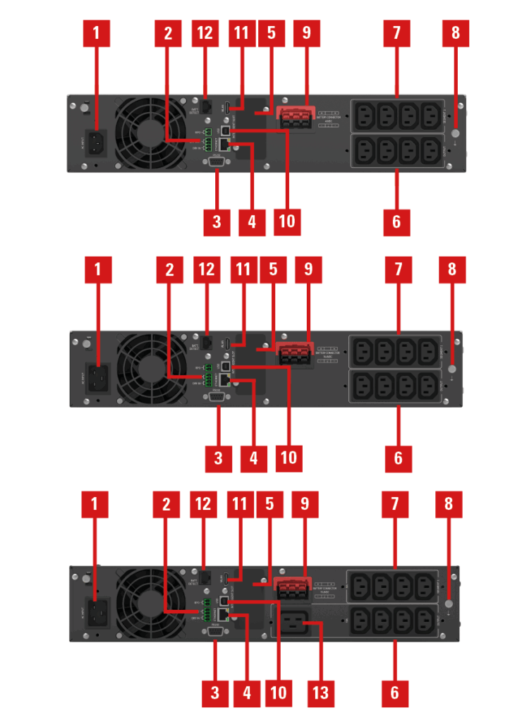 Csatlakozó (IEC C14 az 1 000 és 1 500 VA modellekhez; IEC C20 a 2 000 és 3 000 VA modellekhez).
