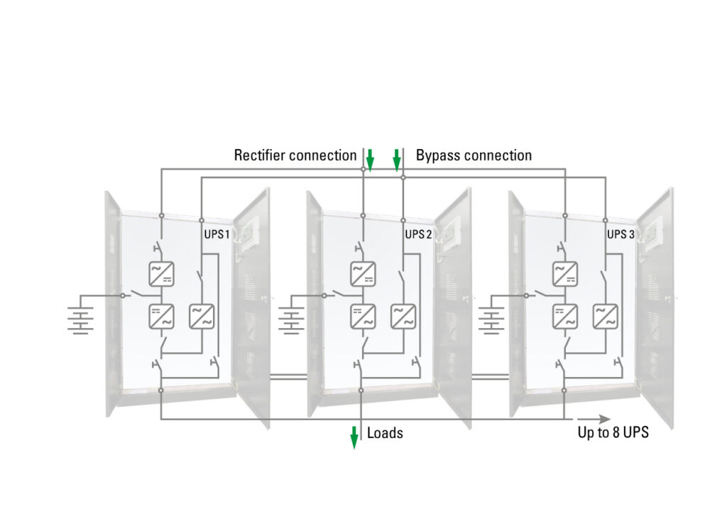 A párhuzamos vezérlés teljesen digitális, és mind az aktív, mind a meddő teljesítmény szinkronizált elosztását biztosítja minden fázisban, még átmeneti állapotok esetén is, így a terhelés pontosan és egyenletesen oszlik meg az UPS-ek között.