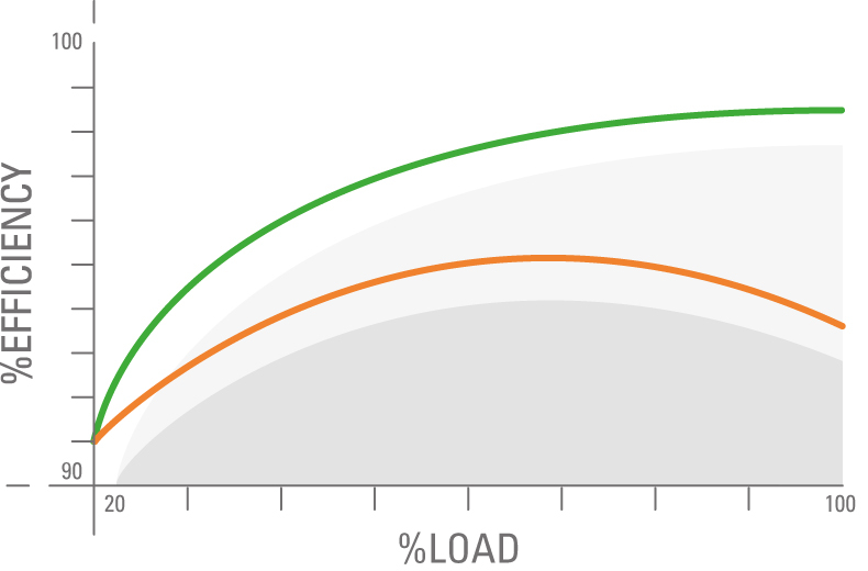 Kiemelkedő teljesítmény Online módban (95–96%) és Smart Eco-módban (>98%), ami csökkenti az üzemeltetési költségeket, a kiépítési költségeket (nincs szükség túlméretezett kábelezésre), a klímaköltségeket (nem nő a hűtési igény), valamint az energiaköltségeket is (kevesebb fogyasztás).