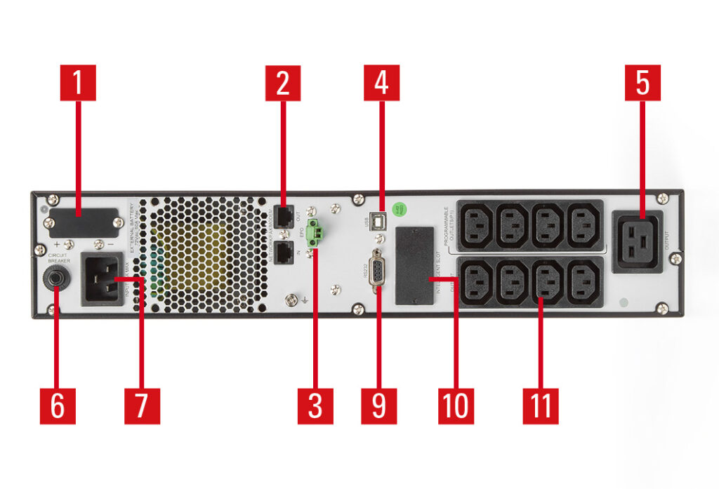 7. Hálózati csatlakozó (IEC C14 az 800, 1100 és 1500 VA modellekhez; IEC C20 a 2000 és 3000 VA modellekhez)